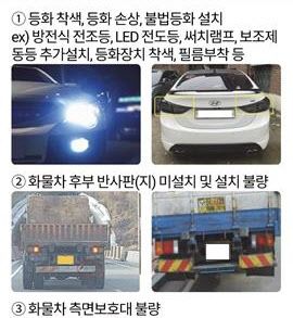 이번 단속에서는 이륜차의 불법튜닝, 안전기준 위반, 번호판 오염·훼손 등의 단속을 강화한다. 아울러 미등록 운행, 미이전 타인명의 자동차 등 불법명의 ‘대포차’와 불법튜닝 및 안전기준 위반, 방치자동차 등도 집중적으로 단속할 예정이다.