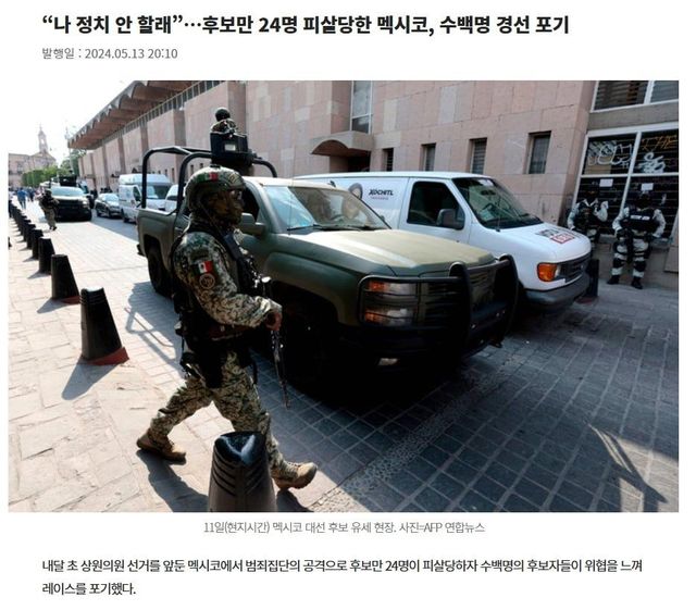 내달 2일 멕시코에서는 대통령 선거, 국회의원 선거, 지방선거가 동시에 열린다. 이 가운데 조직범죄 집단들이 자신들에게 우호적인 후보자를 당선시키거나 적대적인 후보를 없애기 위해 후보자를 제거하면서 현재까지 피살당한 후보만 24명이 됐다.이로 인해 수백 명의 후보자들이 선거를 중도 포기한 것으로 나타났다. 또한 400명 이상의 후보자가 연방 정부에 경호팀을 요청했다.