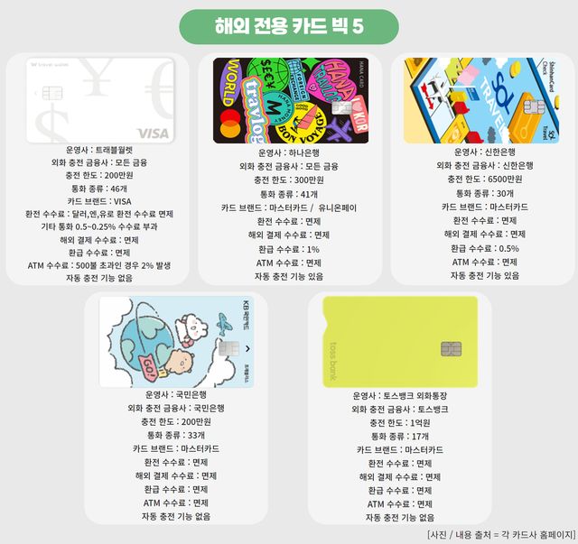르데스크가 다양한 해외전용카드의 정보와 혜택에 대해 조사했다. 최근 출시된 카드 2종과 과거부터 꾸준히 인기 있던 3종을 비교했다.