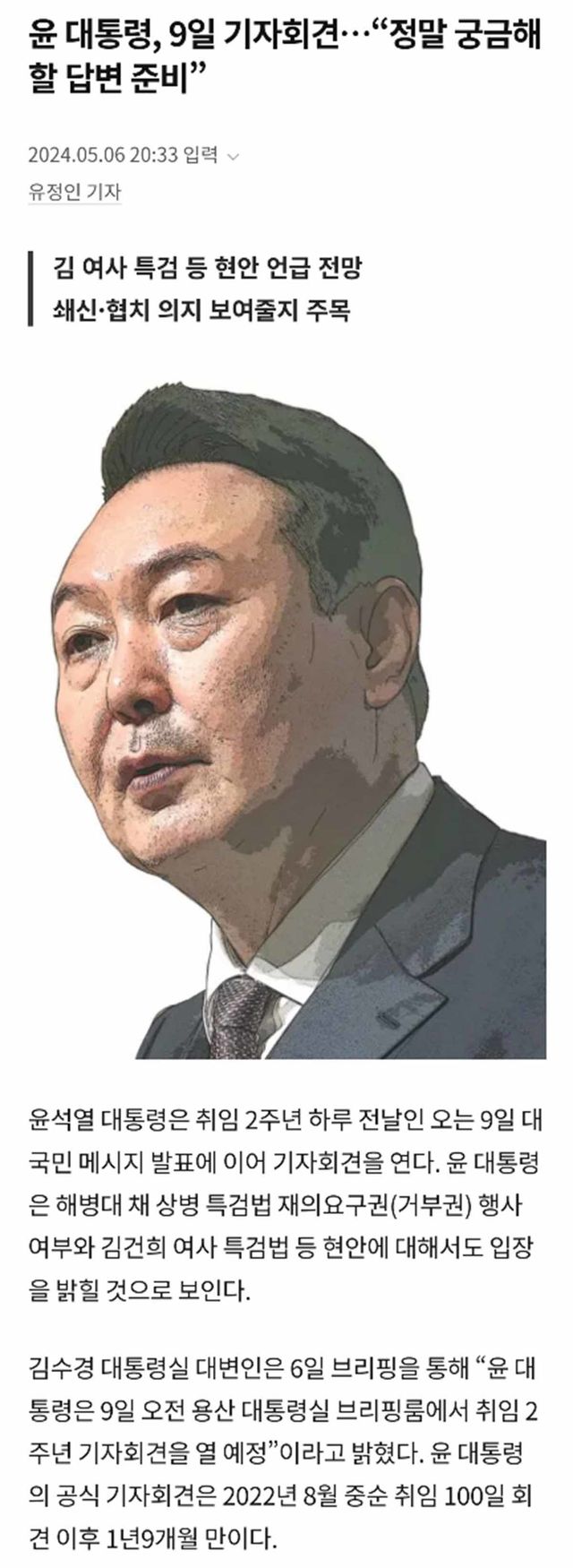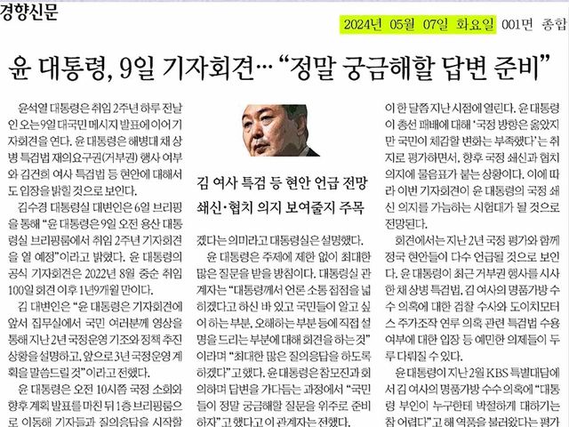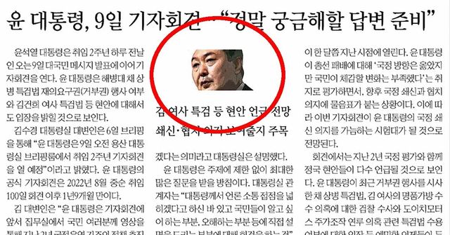 한편 경향신문은 인터넷판에서 <윤 대통령, 9일 기자회견 "정말 궁금해할 답변 준비"> 기사에 쓰인 윤 대통령 사진을 위와 아래가 잘리지 않은 것으로 교체했다