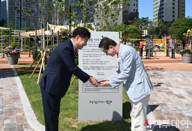 최호권 영등포구청장이 16일 오전 서울 영등포구 문래동 꽃밭정원에서 주민 대표 최균범 문래동주민자치위원장으로부터 감사패를 전달받고 있다.