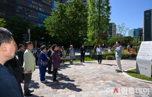 최호권 영등포구청장이 16일 오전 서울 영등포구 문래동 꽃밭정원에서 주민대표로부터 감사패를 전달받은 뒤 소감을 밝히고 있다.
