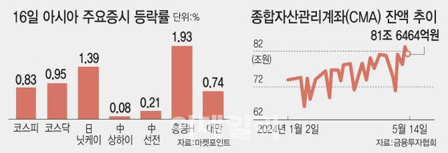 금융투자협회에 따르면 지난 14일 기준 81조6464억원이 쌓여있다. 특히 13일에는 84조2496억원을 기록하며 통계 집계 이후 최대치를 기록하기도 했다. MMF 역시 현재 204조9101억원이 몰렸다. 지난해 말보다 35조792억원 늘어난 것으로 5월 들어 MMF는 단 한번도 200조원 아래로 내려가지 않았다. 금리 불확실성 탓에 단기자금처에 돈이 쏠려 있었다는 이야기다.