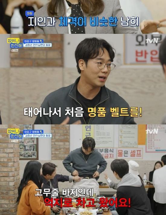 김남희는 "벨트를 선물해주셨는데 태어나서 처음으로 명품 벨트를 가진 거다. 이거 반바지이지 않냐. 고무줄 바지인데 억지로 차고 나왔다"라며 실제 김희선이 선물한 명품 브랜드의 벨트를 보여줬다.