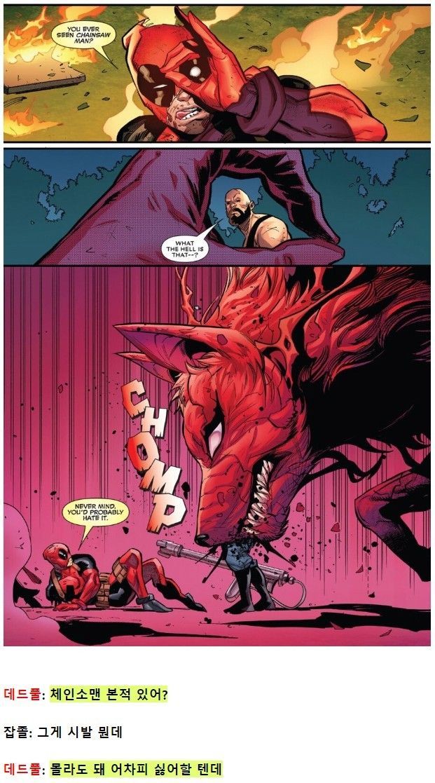 (참고로 저 늑대처럼 생긴 괴물은 심비오트 생명체 이름은 '프린세스'고 데드풀을 아빠처럼 따른다고함)