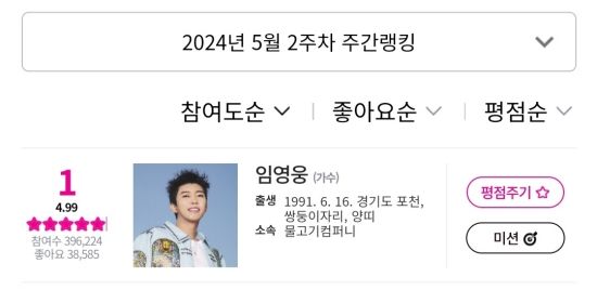 아이돌차트에 따르면, 지난 5월 10일부터 5월 16일까지 집계된 평점랭킹에서 임영웅은 39만 6,224표를 얻어 최다득표를 기록했다.
