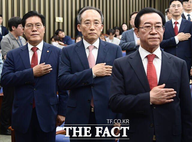 국민의힘이 5·18 민주화운동 44주년을 맞아 "5·18 정신은 더 이상 특정 정치세력의 상징이 아닌 온전한 대한민국 민주화의 상징이 돼야 한다"고 밝혔다. 국민의힘 원내대표 후보로 출마한 송석준, 추경호, 이종배 의원(왼쪽부터)이 9일 오후 서울 여의도 국회에서 열린 2024 원내대표 선출 선거 당선자 총회에 참석해 국민의례를 하고 있다. /이새롬 기자