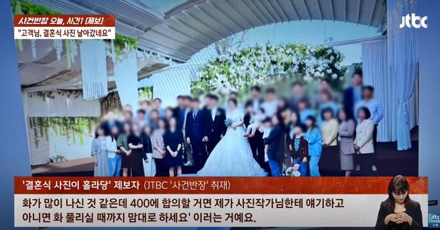 A 씨는 "사진작가가 '원판 사진이 한 장도 남김없이 모두 날아갔다'며 사과했다. 결혼식 전 찍은 스냅 사진을 이용해 합성해 준다고 했다"고 토로했다.