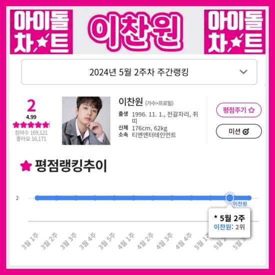 (엑스포츠뉴스 이정범 기자) '찬또배기' 이찬원이 5월 2주 차 아이돌차트 평점 랭킹 2위에 올랐다.