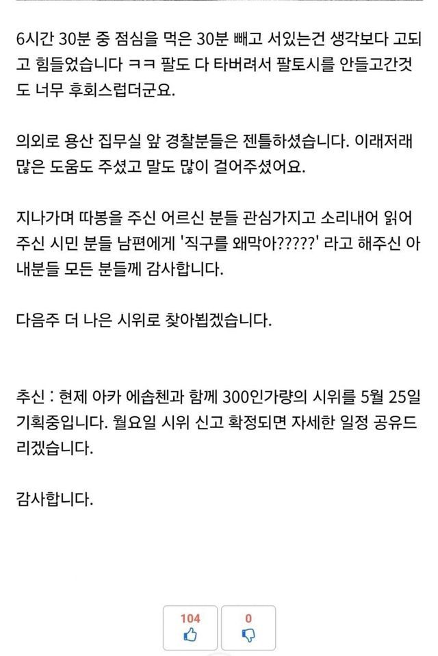 시위하기전까지 너무답답하고 무력했었는데 그래도 내가 할 수있는 범위에서 할 일해서 만족스럽고 잠도 제대로 못잔 어제 그저께와 달리 맘편히 할일하고 잘 수 있을것 같다.
