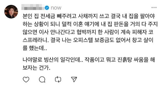 최PD는 "본인 집 전세금 빼주려고 사채까지 쓰고 결국 내 집을 팔아야 하는 상황이 되니 덜컥 이혼 얘기에 내 집 판 돈을 거의 다 주지 않으면 이사 안 나간다고 협박까지 한 삶이 계속 피해자 코스프레라니. 결국 나는 오피스텔 보증금도 없어서 창고 살이를 했는데"라는 내용이 담겨 있다.