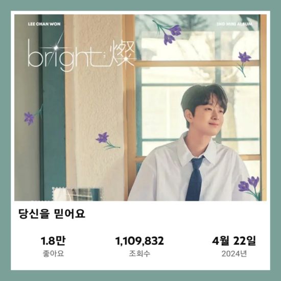 지난 4월 22일 이찬원의 공식 유튜브 채널(일명 또튜브)에는 그의 두 번째 미니앨범 'bright;燦'의 3번 트랙 '당신을 믿어요'가 게재됐다.