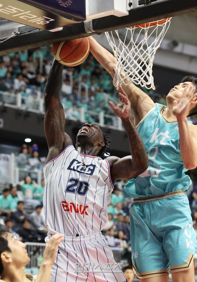 5일 수원 KT아레나에서 열린 2023~2024 정관장 프로농구챔피언결정전 5차전 수원 KT와 부산 KCC 경기. KT 하윤기가 KCC 라건아의 슛을 저지하고있다. 수원=정시종 기자 capa@edaily.co.kr /2024.05.05.