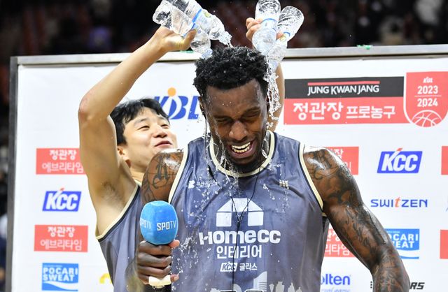29일 부산사직체육관에서 열린 KCC와 정관장의 경기. 수훈 선수 인터뷰를 진행하고 있는 라건아(오른쪽)에게 허웅이 물세례를 하고 있다. 사진=KBL