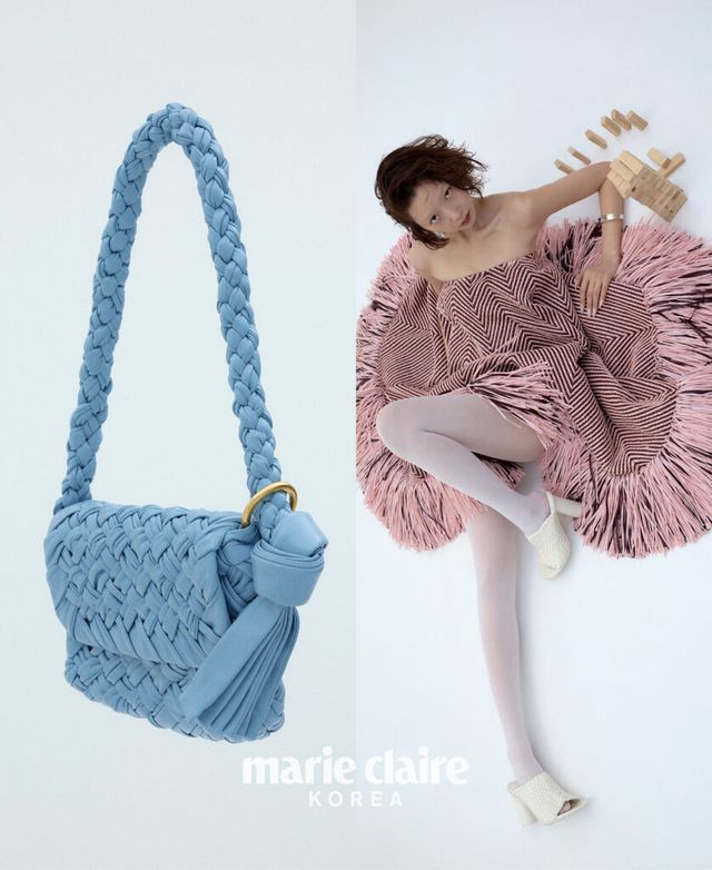 수공예 느낌의 인트레치아토 위빙 기법이 돋보이는 칼리메로 씨타 백, 드레스로 연출한 태슬 장식 레더 스커트, 뮬, 볼드한 이어링과 브레이슬릿 모두 가격 미정