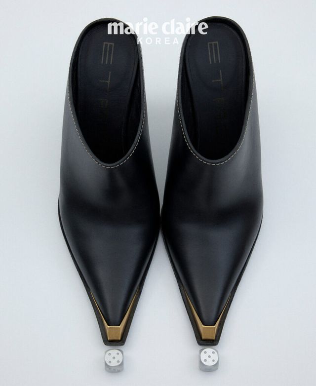 메탈 장식 테이퍼드 토와 솔리드 힐이 독특한 레더 뮬 2백만원대