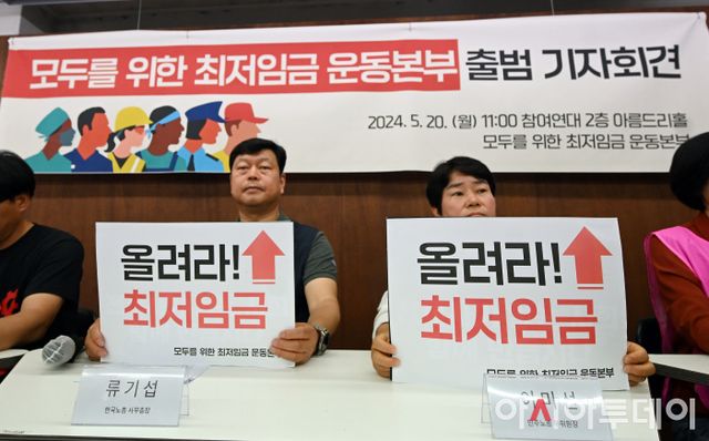 아시아투데이 박성일 기자 = 류기섭 한국노총 사무총장(왼쪽)과 이미선 민주노총 부위원장이 20일 오전 서울 종로구 참여연대에서 열린 모두를 위한 최저임금 운동본부 출범 기자회견을 갖고 있다.
