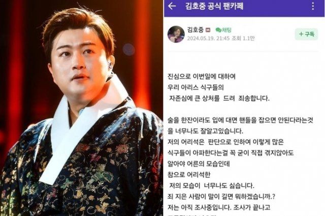 가수 김호중이 음주 뺑소니 사고를 낸 후 10일 만에 사실을 인정하며 수습에 나섰지만, 그를 향한 비난은 더욱 거세지고 있다. 사진제공|김호중 팬카페