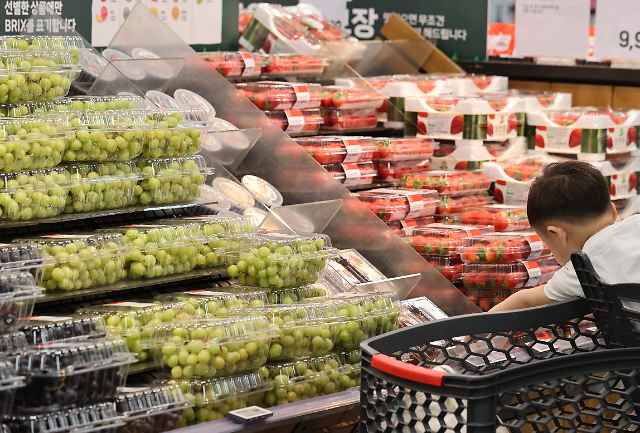 2日,在首尔一家大型超市市民在选购水果。【图片提供 韩联社】