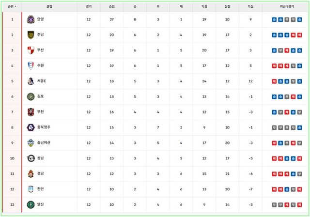 20일 현재 '하나은행 K리그2' 팀 순위./K리그