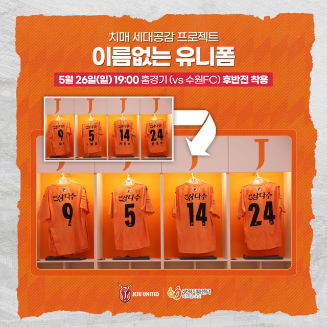 구단에 따르면 26일 오후 7시 제주월드컵경기장에서 열리는 경기에서 제주광역치매센터와 제주는 ‘치매 세대공감 프로젝트’ 캠페인 진행을 위협 업무 협약을 체결한다. 이번 협약에 따라 제주 선수단은 이날 경기서 후반전에 ‘이름 없는 유니폼’을 착용할 계획이다.
