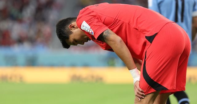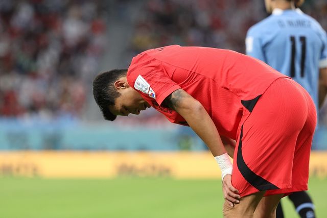 2022년 11월 24일 오후(현지 시각) 카타르 알라이얀 에듀케이션 시티 스타디움에서 열린 2022 카타르 월드컵 조별리그 H조 1차전 대한민국-우루과이 경기에서 김민재가 볼 경합 후 숨을 고르고 있다. / 뉴스1