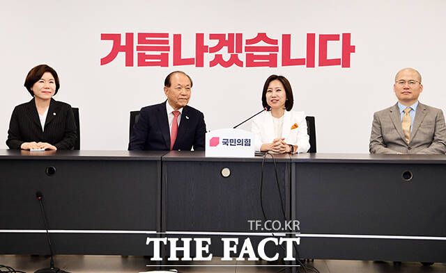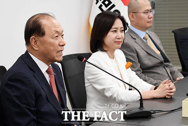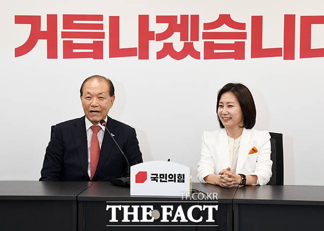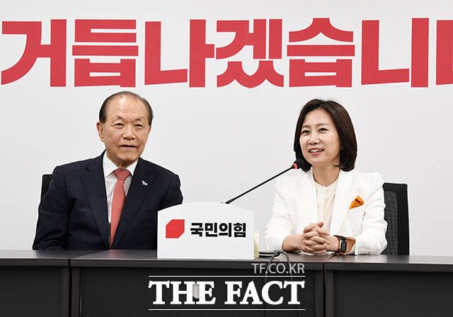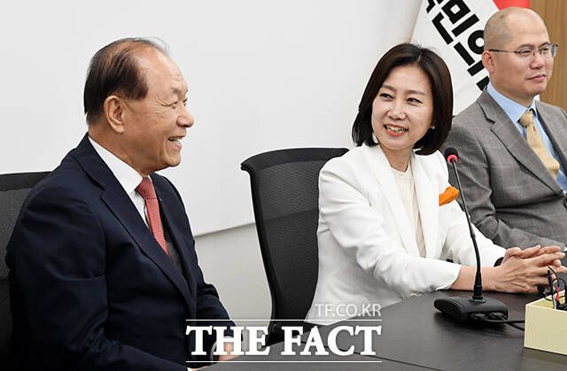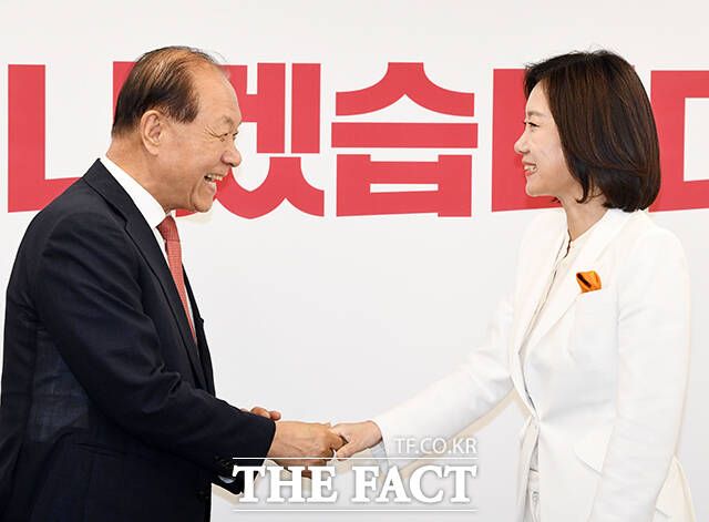 [더팩트ㅣ국회=배정한 기자] 황우여 국민의힘 비상대책위원장(왼쪽)이 21일 오전 서울 여의도 중앙당사에서 허은아 개혁신당 대표를 접견하며 악수를 하고 있다.