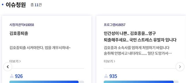현재 작성자 A 씨가 올린 청원 게시판은 동의자만 약 900명으로 곧 1000명을 달할 것으로 보인다. 이외에도 김호중의 퇴출을 주장하는 청원 게시판만 5개가 넘는다.