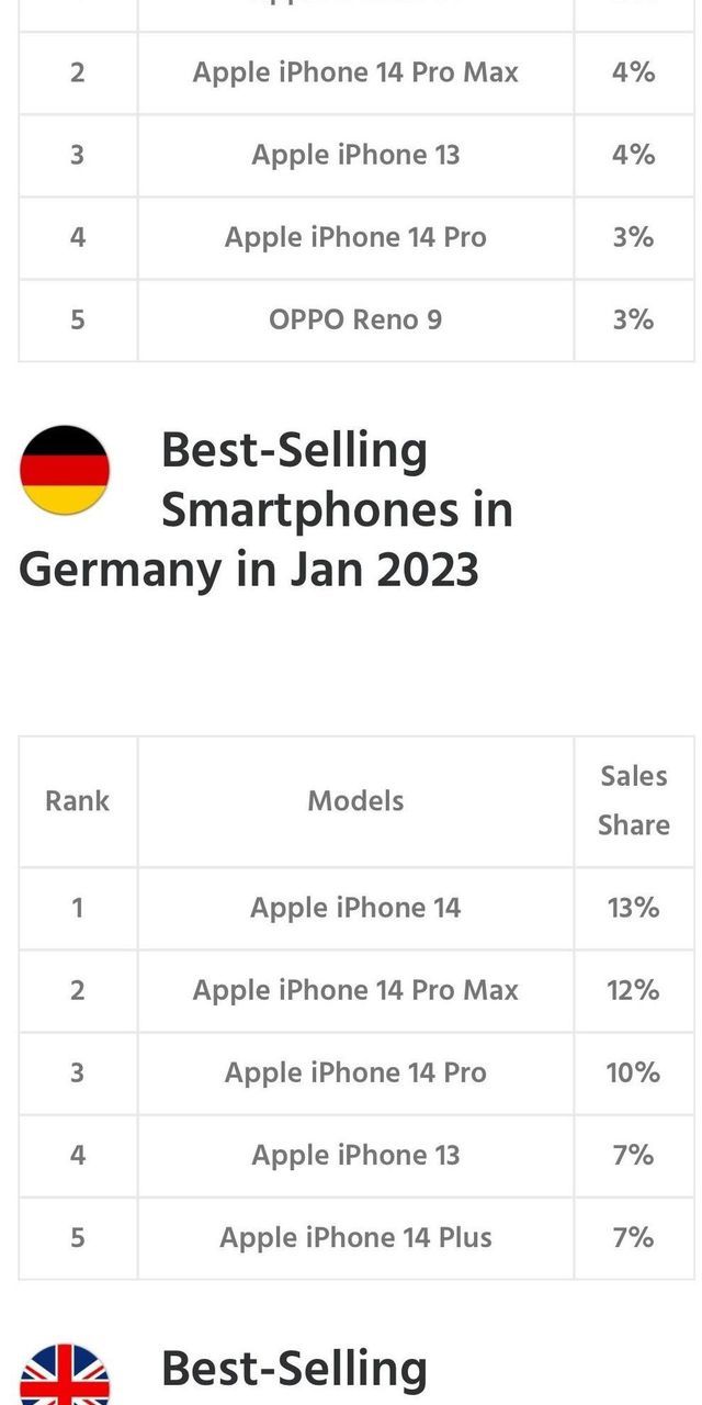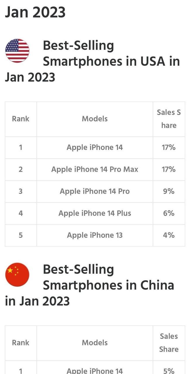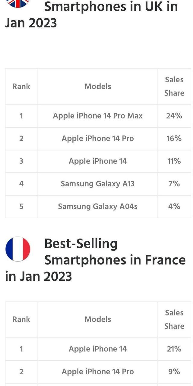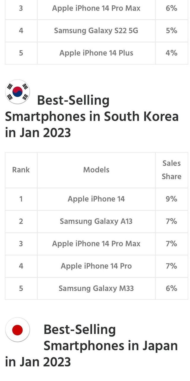 23년 1월 나라별 가장 많이팔린 스마트폰 …