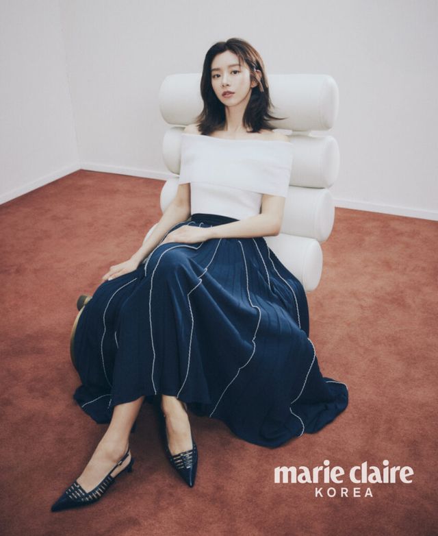 오프숄더 화이트 니트 톱, 화이트 자수 포인트 네이비 니트 소재의 컬러 스커트, 컷아웃 디테일 다크 네이비 슬링백 힐 모두 가격 미정