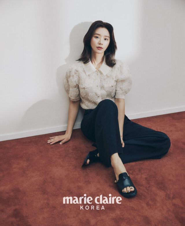 플라워 패턴이 돋보이는 블라우스, 네이비 와이드 팬츠, 오픈 토가 돋보이는 레더 슬라이드 힐 모두 가격 미정