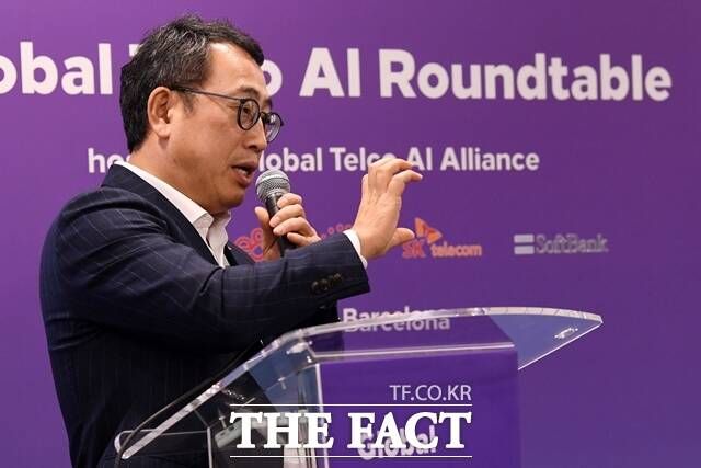 유영상 SK텔레콤 CEO가 지난 3월 열린 MWC 2024에서 AI 전략에 대해 설명하고 있다. 유영상 CEO는 지난 21~22일 열린 AI 서울 정상회의에서 '지속 가능하고 신뢰할 수 있는 AI'라는 주제로 발표에 나서 AI 발전 방안을 제안했다. /더팩트 DB