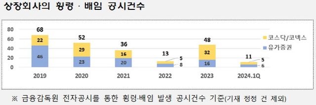 금감원에 따르면 상장회사의 횡령·배임 공시건수는 올해 1분기에만 11건에 달했다. 이대로 가면 지난해 2022년 한 해 횡령·배임 공시건수(13건)를 뛰어넘고, 지난해 48건에 육박하게 된다. 금감원은 “자금·회계담당 직원의 횡령, 현금·매출채권 또는 매입채무 잔액 조작·은폐 등 회계위반 사례가 지속적으로 발생하고 있다”고 지적했다.