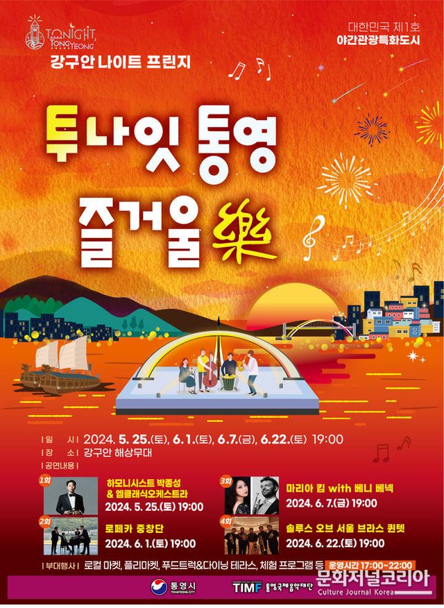 문화저널코리아 조정일 기자 | 통영시(시장 천영기)는 오는 25일 토요일 오후 7시부터 강구안 해상무대에서 ‘투나잇 통영! 즐거울 락’첫 번째 공연을 개최한다.