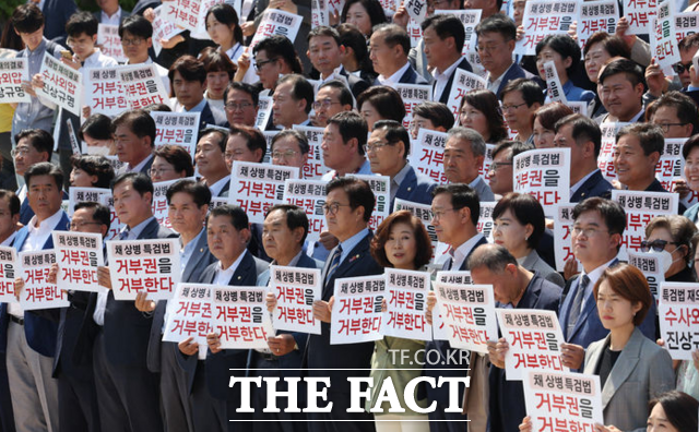 더불어민주당 등 야당 의원들이 21일 서울 여의도 국회 앞 계단에서 열린 채해병 특검법 재의 요구 규탄 야당, 시민사회 공동기자회견에서 참가자들이 피켓을 들고 있다. /뉴시스