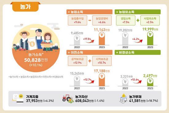 [세종=이데일리 권효중 기자] 지난 한 해 농가가 벌어들인 평균 소득은 5082만8000원으로 사상 처음으로 5000만원을 넘긴 것으로 나타났다. 농작물과 축산 등에서 수입이 고르게 늘었지만, 노무비와 경비 등 부담으로 인해 농업 경영비 역시 늘어나 2022년에 이어 1년만에 역대 최고치를 갈아치우고, 부채 역시 최고 수준을 기록했다.