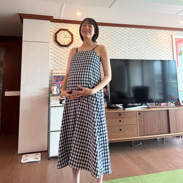 공개된 사진에서 이은형은 원피스를 입은 채 손으로 배를 살짝 받치고 있다.
