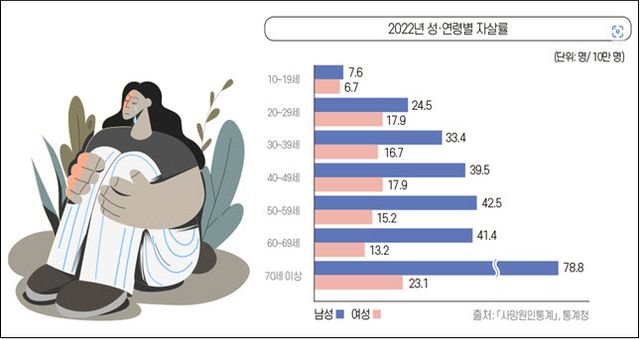 연령대별로 살펴보면 10~40대에 자살로 인한 사망위험이 상대적으로 높기 때문에 정신건강 문제를 젊은이들의 건강문제로 여기기도 한다. 하지만, 실제로 자살로 인한 사망은 남성 70, 80대에서 각각 10만 명당 117.9명, 61.9명으로 가장 높다. 이는 OECD 22개국 중 가장 높은 수준이다.