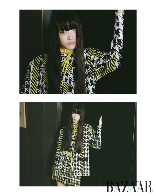 니트 재킷, 톱, 스커트, 초커, 레이어드한 목걸이, 벨트는 모두 Chanel.