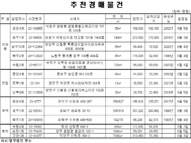 서울 노원구 중계동 경남 아파트 2동 1006호가 경매 나왔다. 중평초등학교 북서측 인근에 소재한 물건으로 15개동 1890가구의 대단위 아파트 단지로 1989년 6월에 입주했다. 15층 건물 중 10층으로 남향이며 85.0㎡(31평형)의 2베이 구조로 방이 3개다. 동일로, 섬발로 등을 통해 차량 진 출입이 수월하며 지하철 7호선 하계역이 걸어서 10분 거리에 있다. 중평초등, 중평중, 대진고교 등이 단지 인근에 있어 교육환경은 양호하다. 감정가 9억5800만원에서 한 차례 떨어져 7억6640만원에 매각이 진행된다. 등기부 등본상 근저당 2건 등은 매각 후 잔금 납부시 소멸된다. 소유자가 거주하고 있어 매각 시 인도부담이 적다. 시세는 8억2000만원에서 8억9000만원에 거래되고 있으며 전세가는 4억4000만원에서 5억원 선이다. 매각일자는 6월4일 서울북부지방법원 경매 1계다. 사건번호 22 - 110476