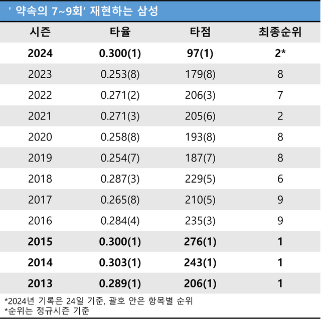 7~9회로 범위를 넓혀도 압도적이다. 해당 이닝 동안 삼성은 팀 타율 0.300에 97타점을 기록했다. 타율과 타점 모두 리그 1위. 삼성이 리그에서 7~9회 타격 성적이 가장 좋았던 시즌은 타율 0.300에 276타점을 기록했던 2015년이 마지막이었다. 삼성은 2013년(타율 0.289, 206타점)과 2014년(타율 0.303, 243타점)에도 7~9회 가장 좋은 모습을 보였다.
