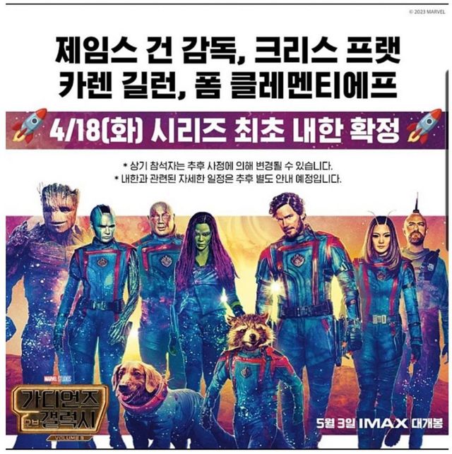 제임스 건 감독, 크리스 프랫(스타로드), 카렌 길런 (네블라), 폼 클레멘티에프 (맨티스) 4월 18일 화요일 내한