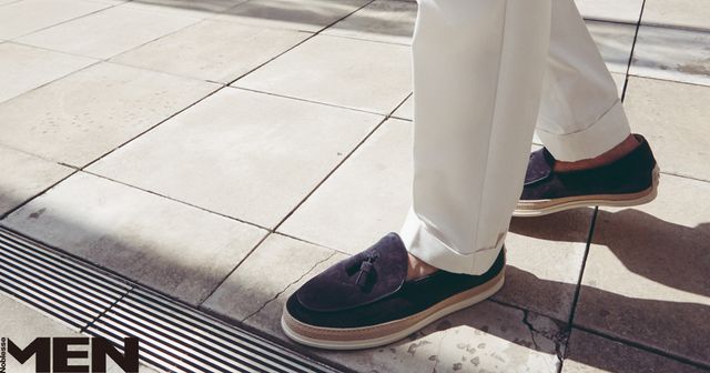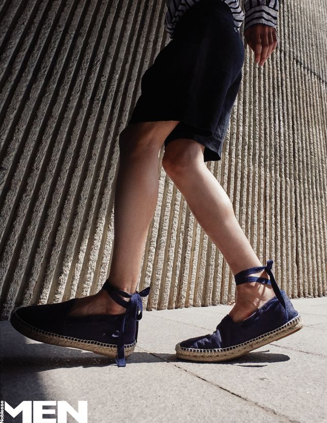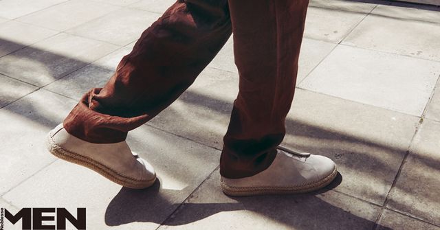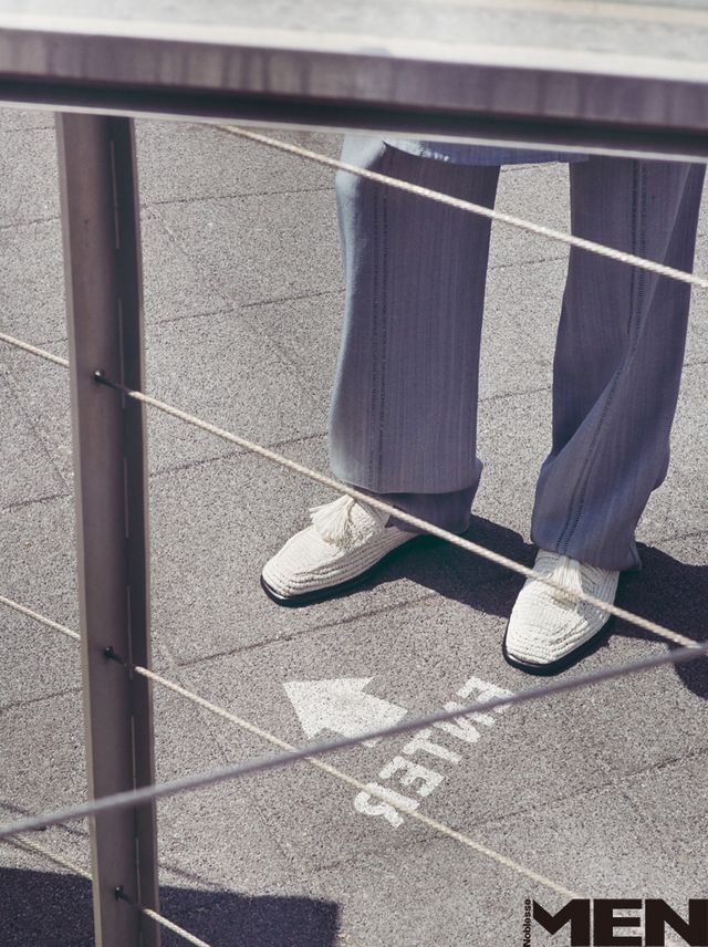 위 _ 브라운 리넨 팬츠와 스웨이드 트리플 스티치TM 에스파드리유 모두 Zegna.