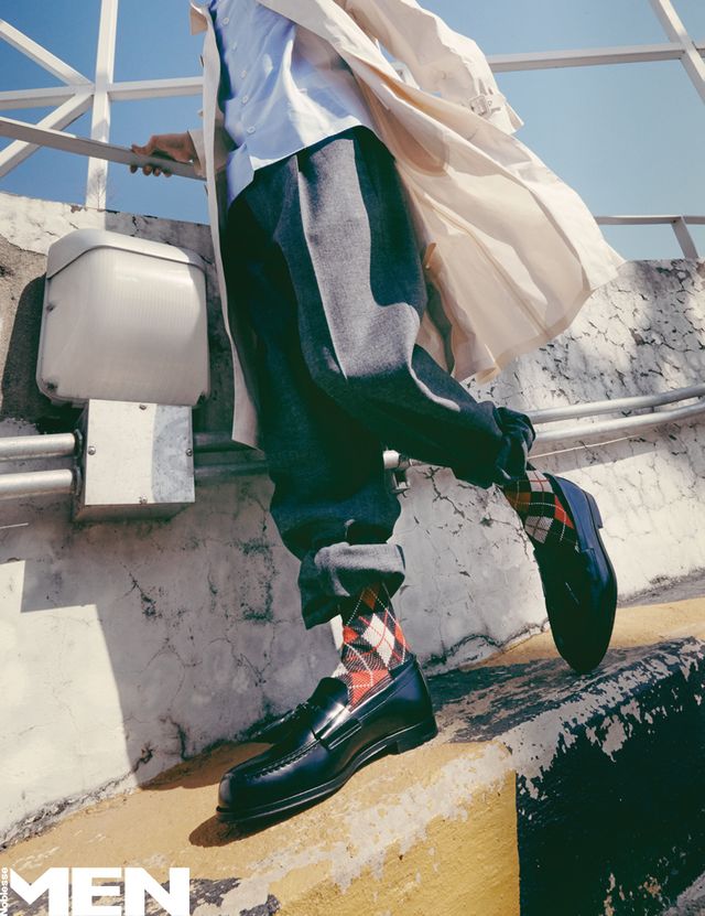 트렌치코트와 블루 셔츠, 그레이 팬츠, 아가일 체크 양말, 블랙 태슬 로퍼 모두 Prada.