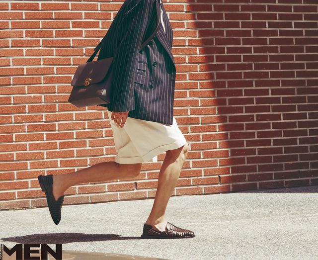 베이지 버뮤다팬츠와 나마 워크 샌들 모두 Loro Piana.