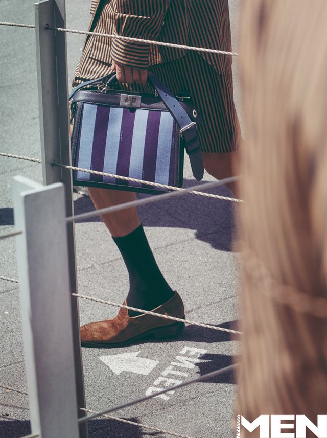 - 스트라이프 패턴 셔츠와 쇼츠, 스트라이프 패턴을 접목한 피카부 아이씨유 미디엄 백, 스웨이드 바게트 로퍼 모두 Fendi Men, 양말 에디터 소장품