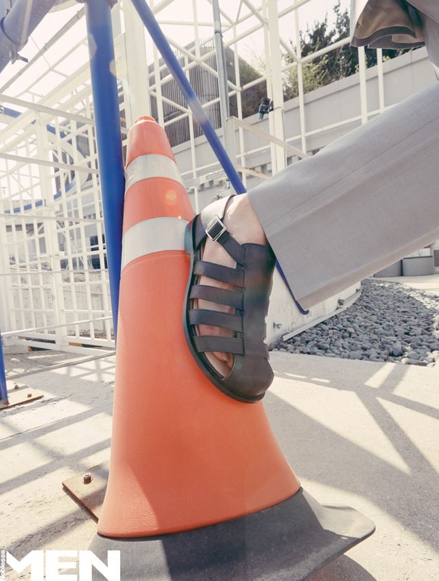 왼쪽 _ 그레이 팬츠와 재킷 Paul Smith, 앞코를 둥글게 처리한 송아지 가죽 캄포 샌들 Loewe.