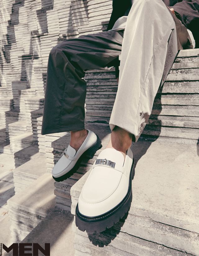 아래 _ 재킷과 톱, 광택감 있는 소재의 팬츠, 켈리 버클 장식 화이트 로퍼 모두 Herme`s.