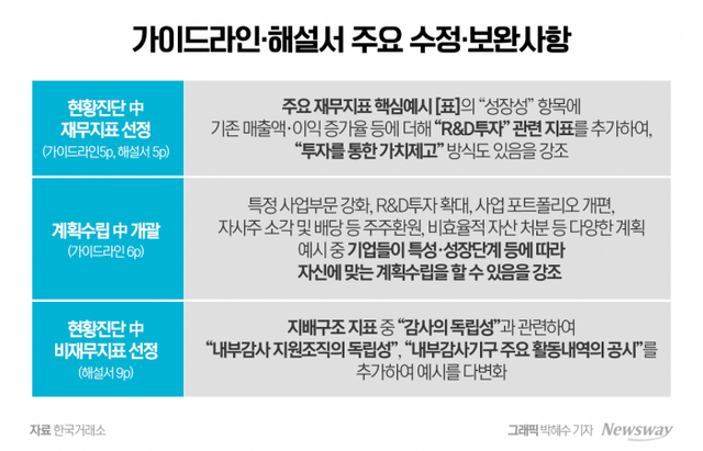 우선 현황 진단을 위한 재무지표 중 R&D(연구개발) 투자 관련 지표가 추가됐다. 지배구조 지표 중에서 감사의 독립성과 관련해 내부감사 지원조직의 독립성, 내부감사기구 주요 활동내역의 공시를 추가해 다양한 예시가 제시됐다. 아울러 기업들이 특성·성장단계 등에 따라 자신에게 맞는 계획을 수립할 수 있다는 점이 강조됐다.