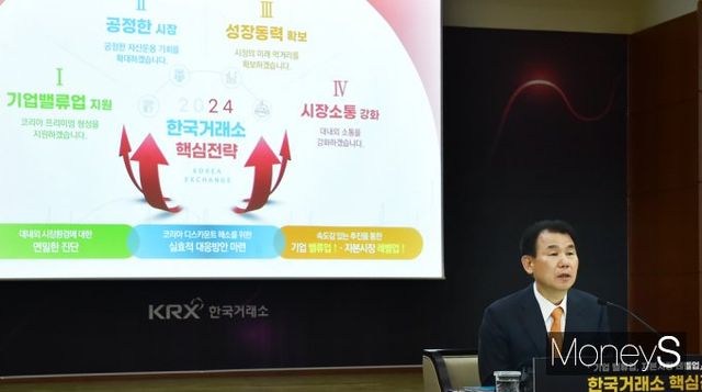 정은보 이사장이 24일 서울 여의도 KRX한국거래소 마켓1타워에서 취임 100일 기자간담회를 진행, '기업 밸류업ㆍ자본시장 레벨업'을 위한 한국거래소 핵심전략을 발표하고 있다.